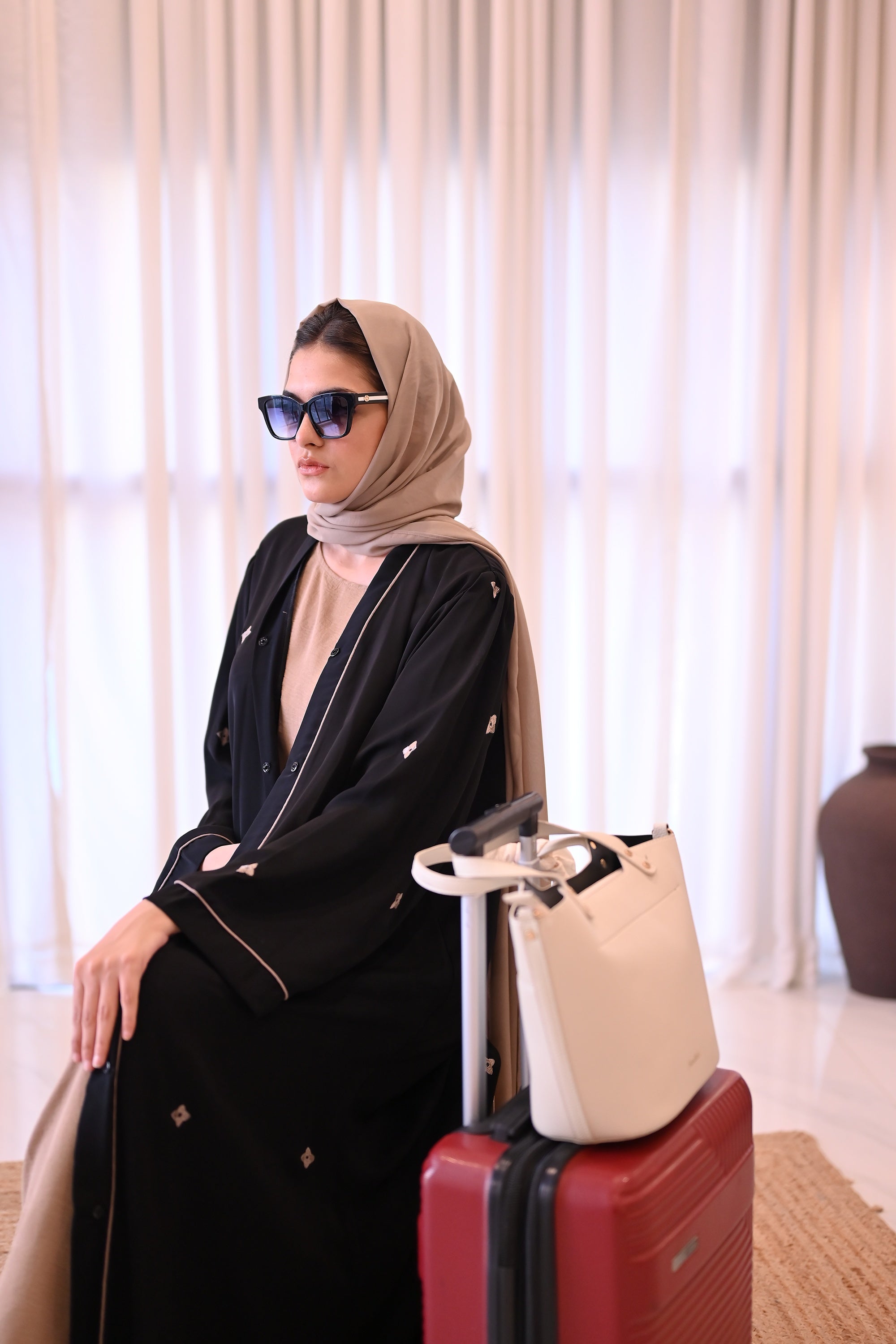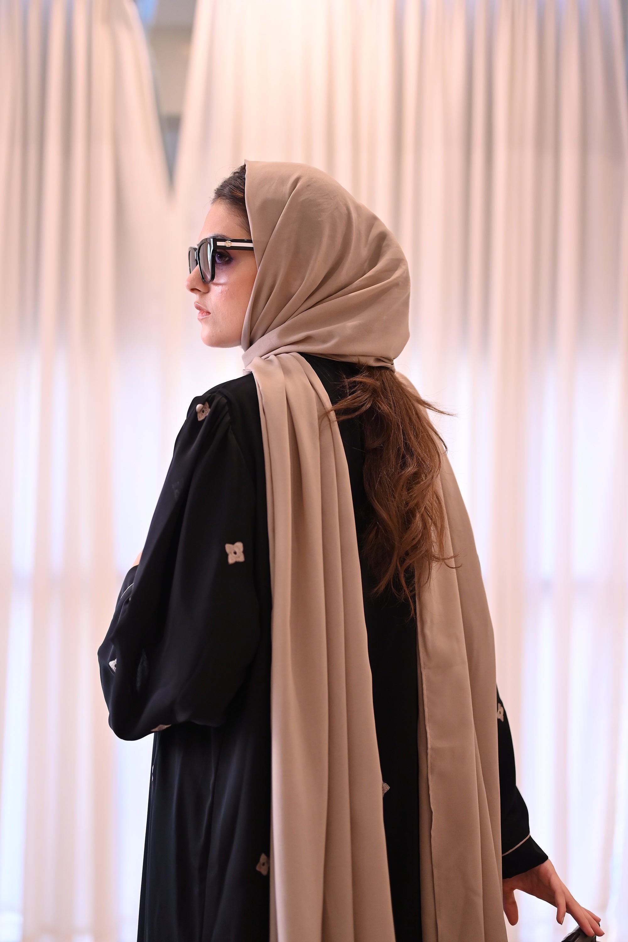 Design: Open abaya style with fine piping detail and scattered geometric embroidery