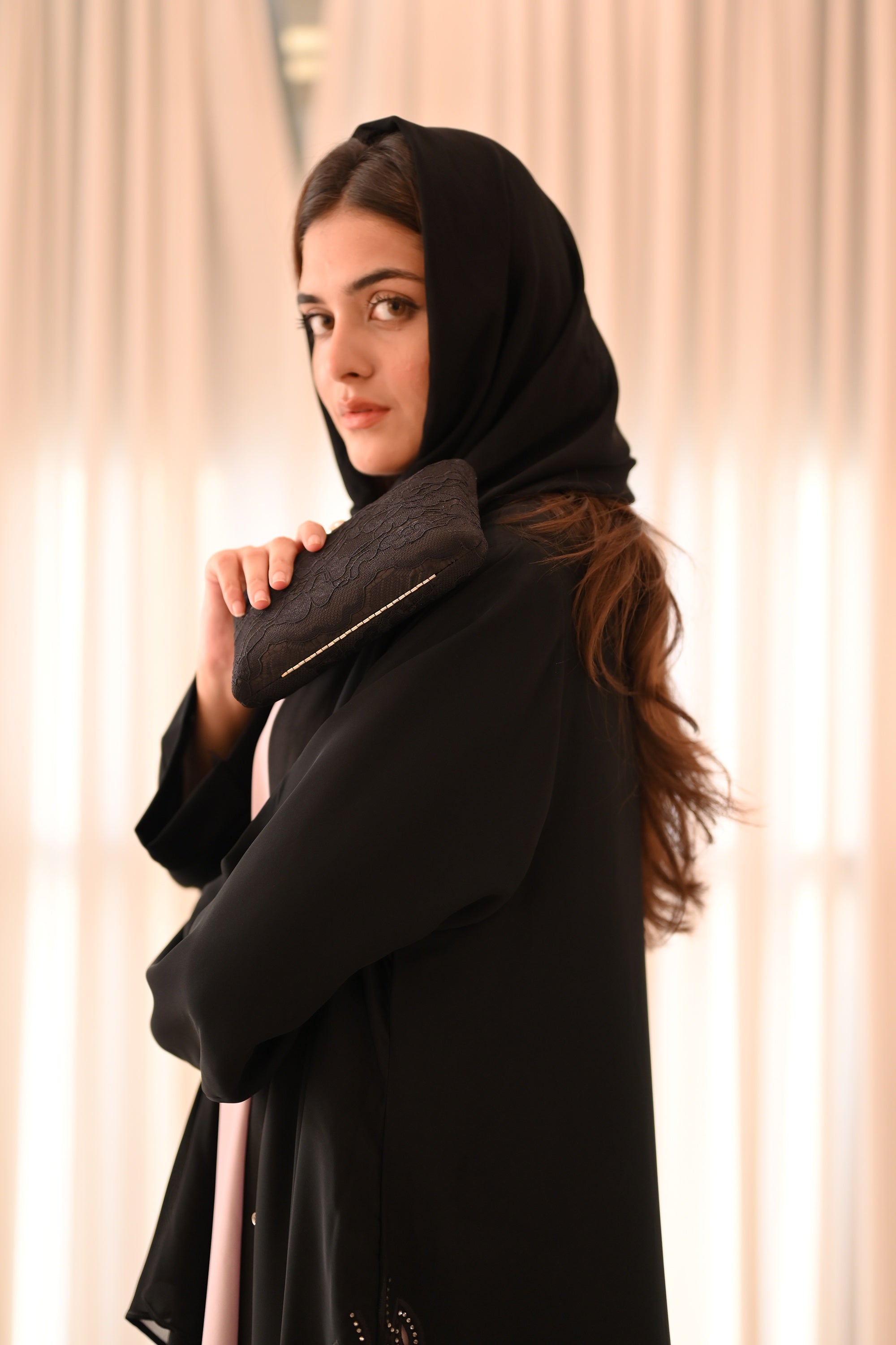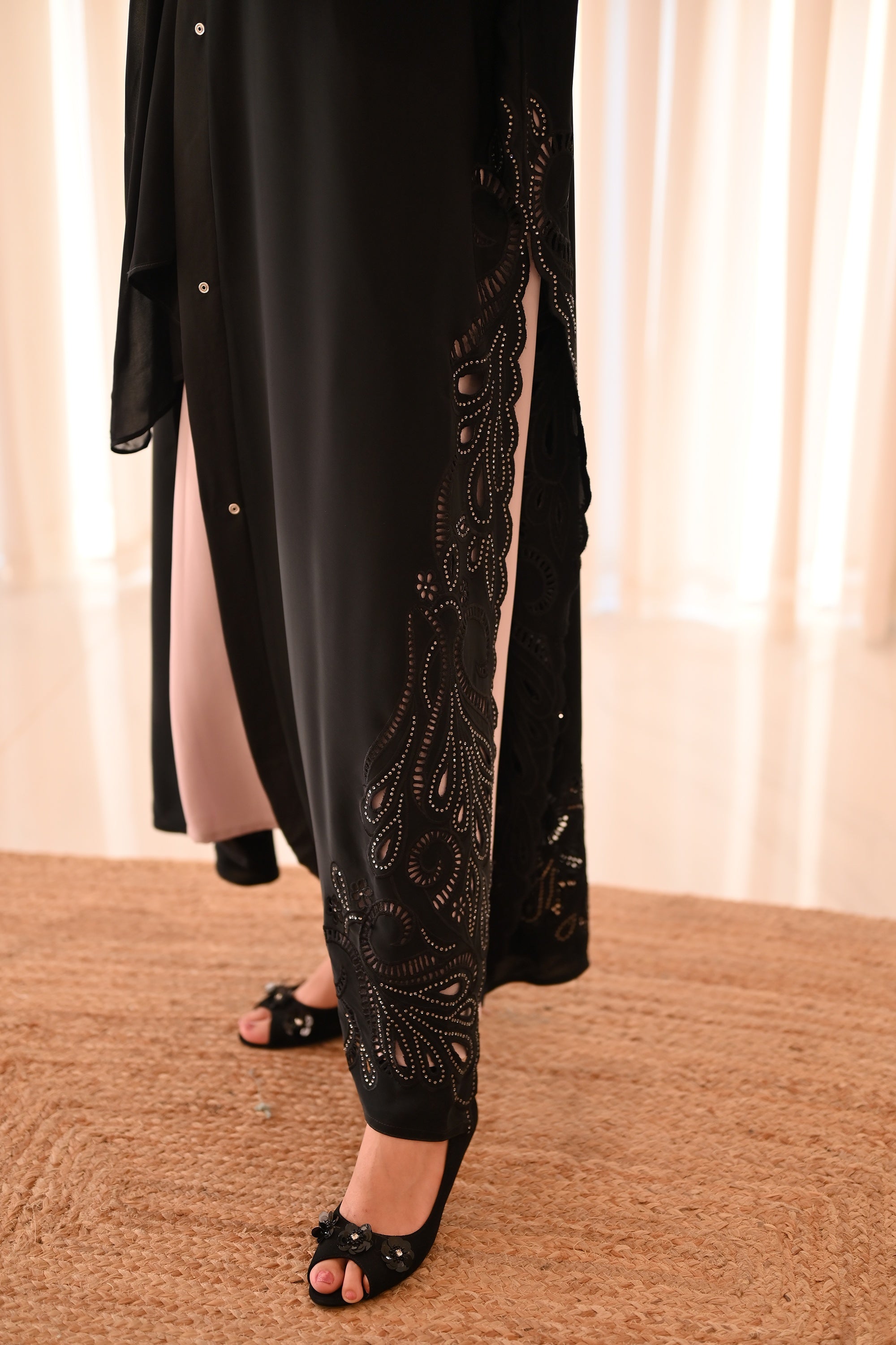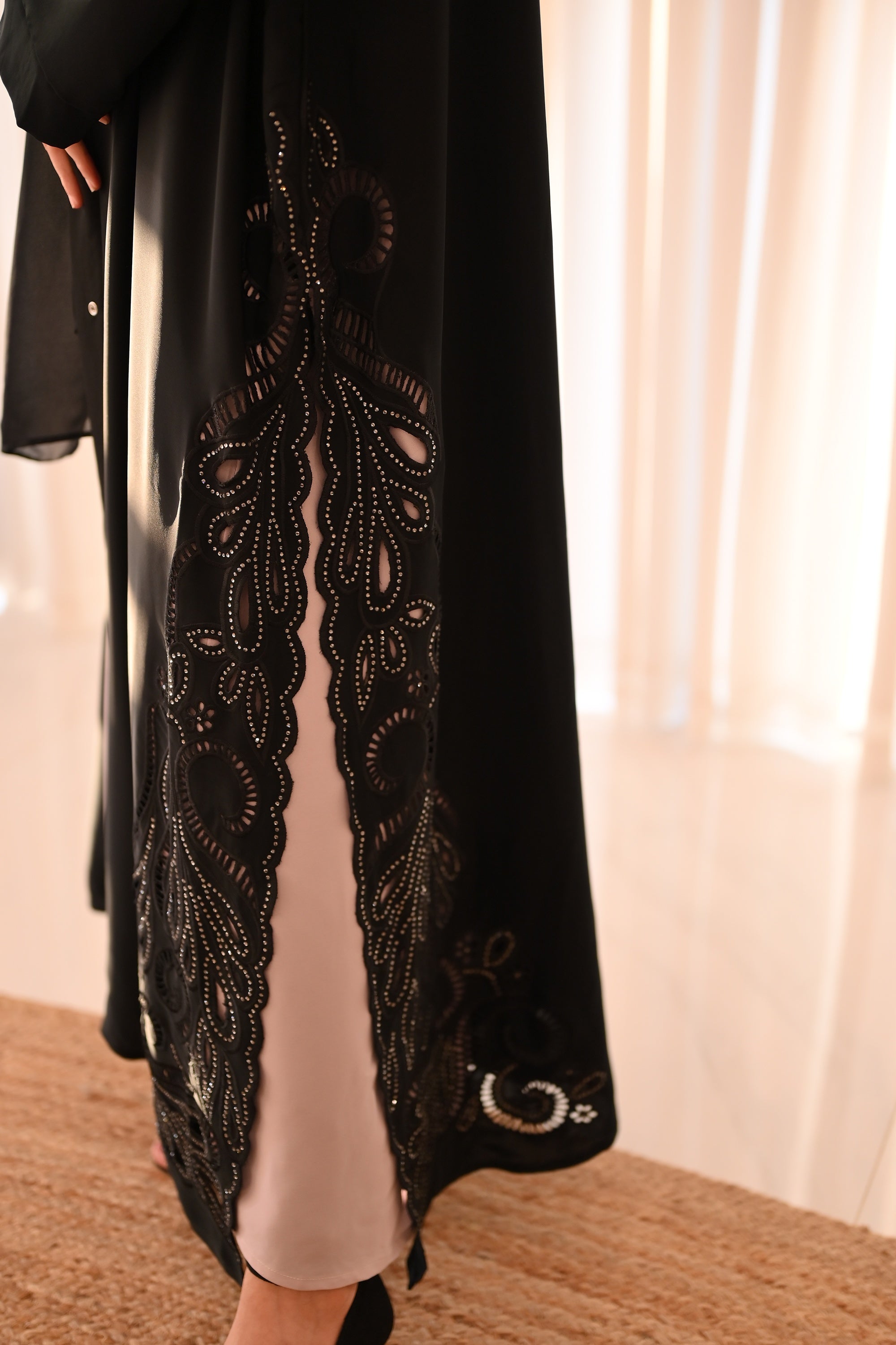 Design: Open abaya style with intricate laser-cut or perforated lace detail along the hem and front edge