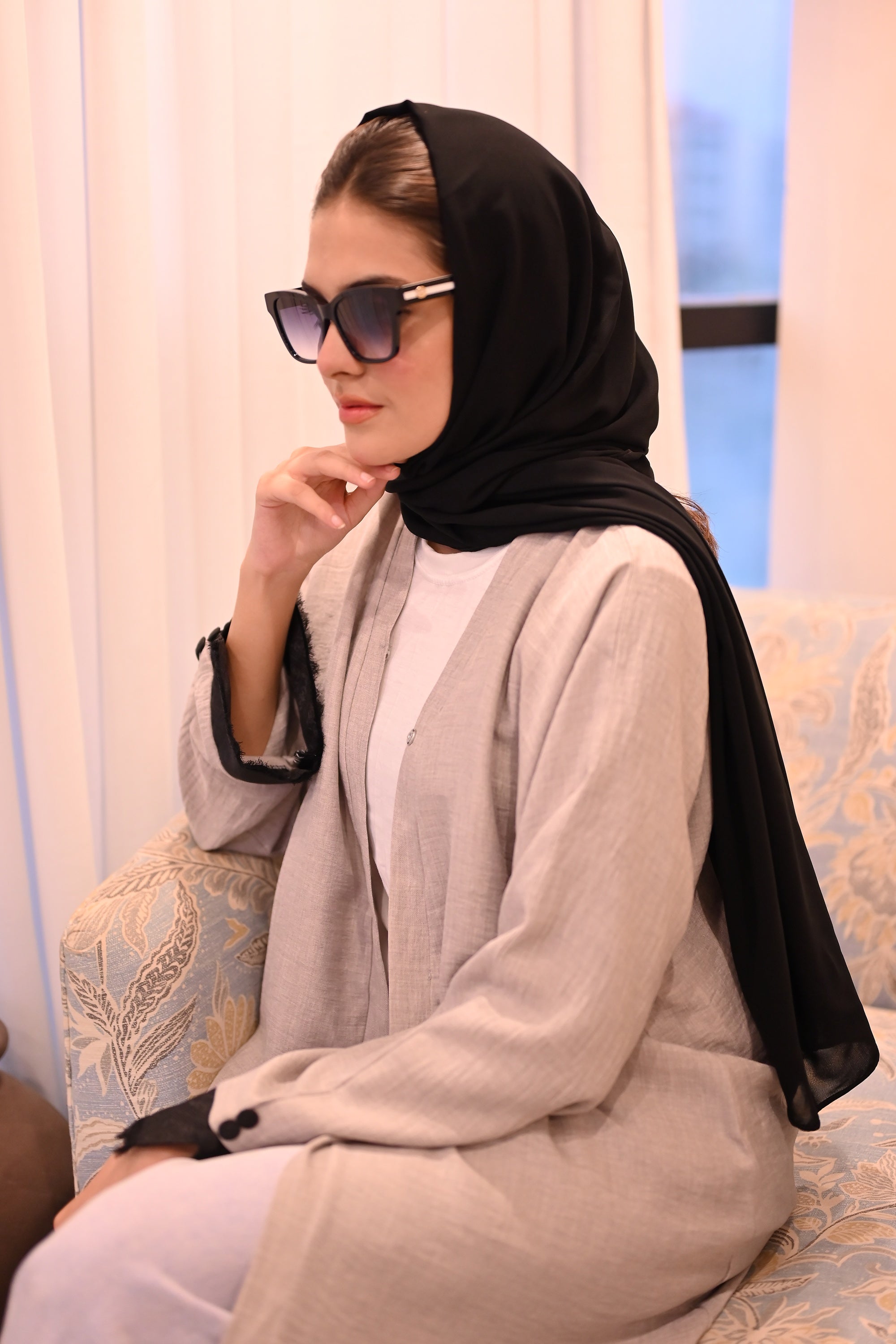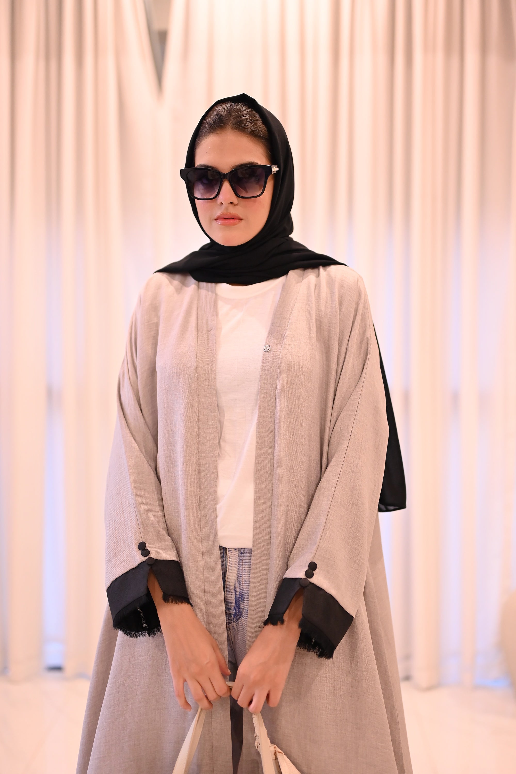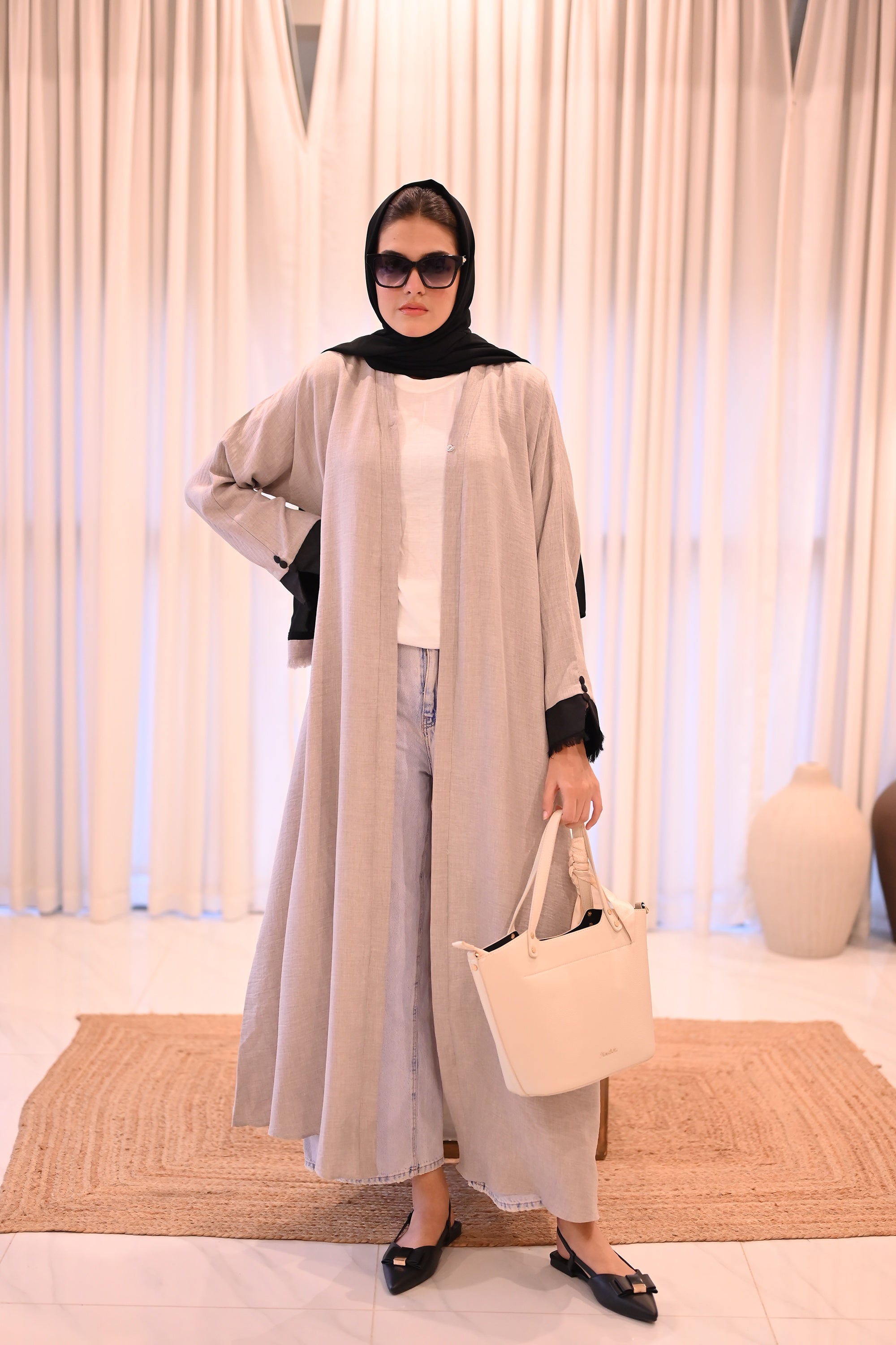 Grace your wardrobe with this stylish light gray abaya, crafted for modern modest elegance. The abaya is made from a breathable fabric with a distinct textured or heathered weave, offering a chic, relaxed aesthetic.