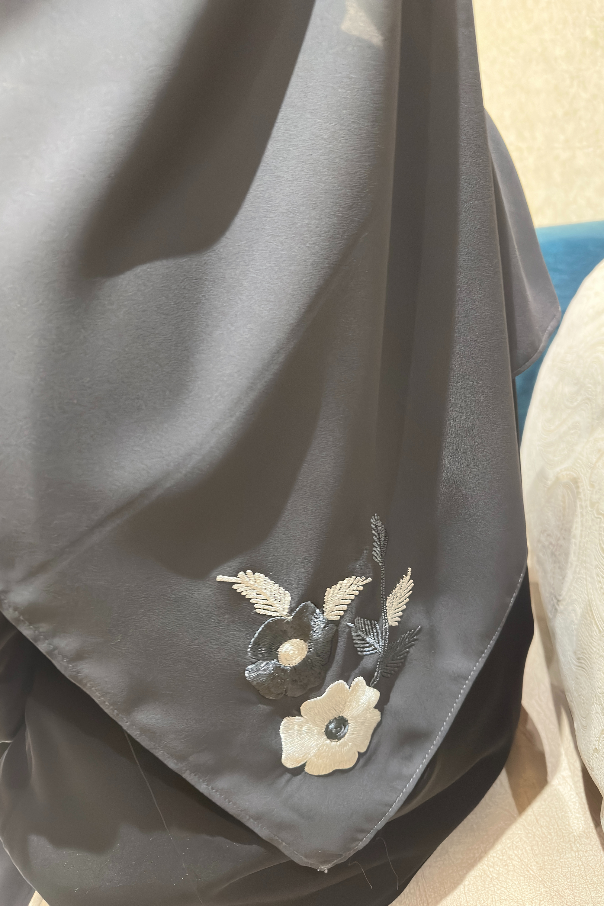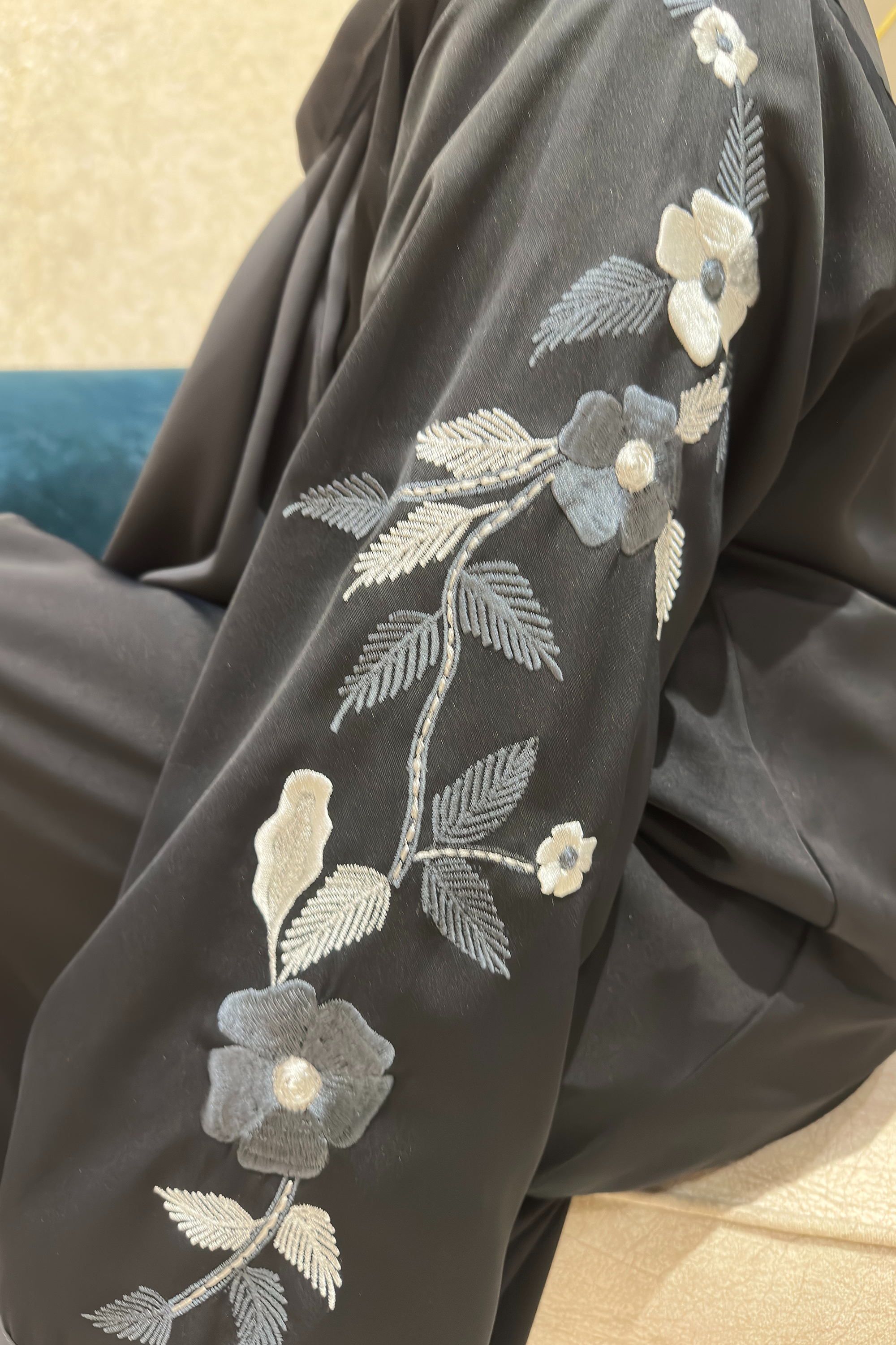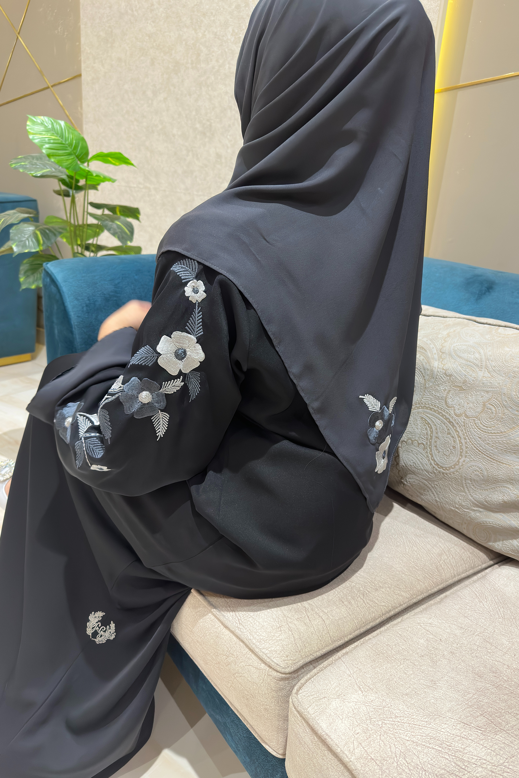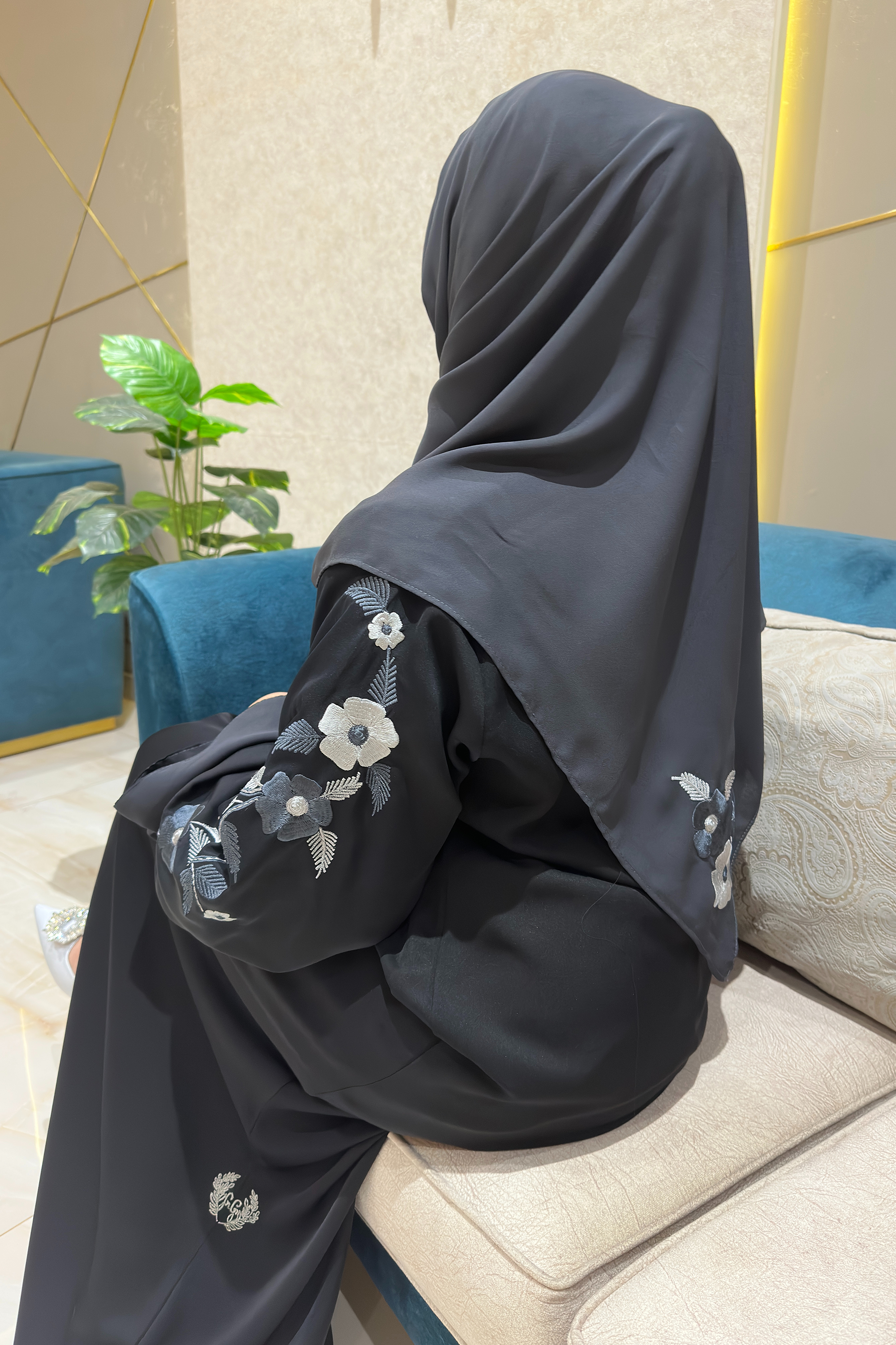 The Moonlit Grace Abaya embodies refined sophistication with a touch of modern elegance. Designed in a flowing black fabric that drapes beautifully, it features exquisite grey floral embroidery along the sleeves adding a luminous charm reminiscent of moonlight. The abaya pairs perfectly with its matching black hijab for a graceful, cohesive look. Ideal for formal occasions or elegant evenings, it exudes confidence, poise, and timeless beauty.