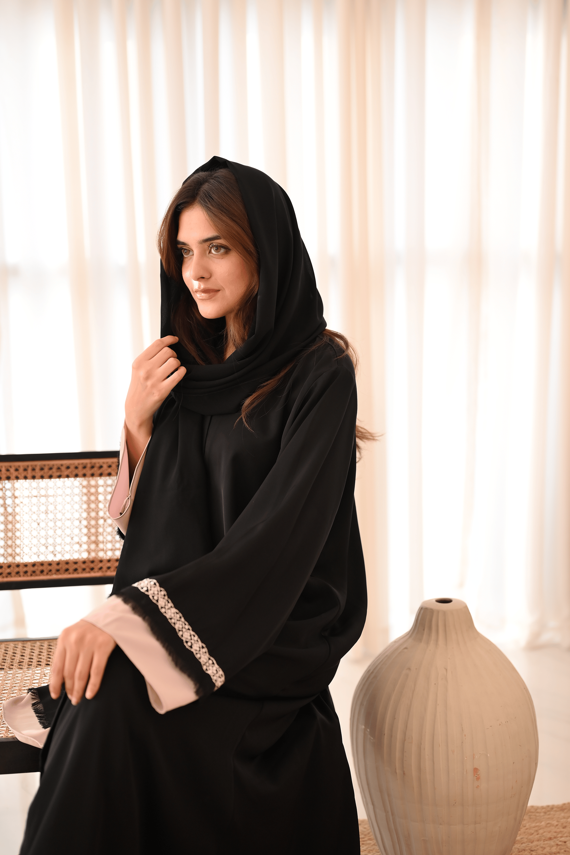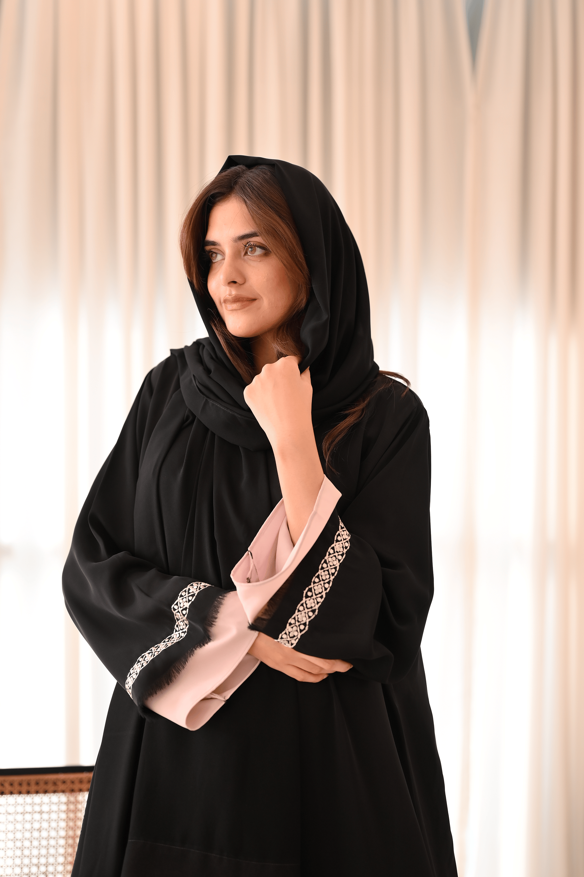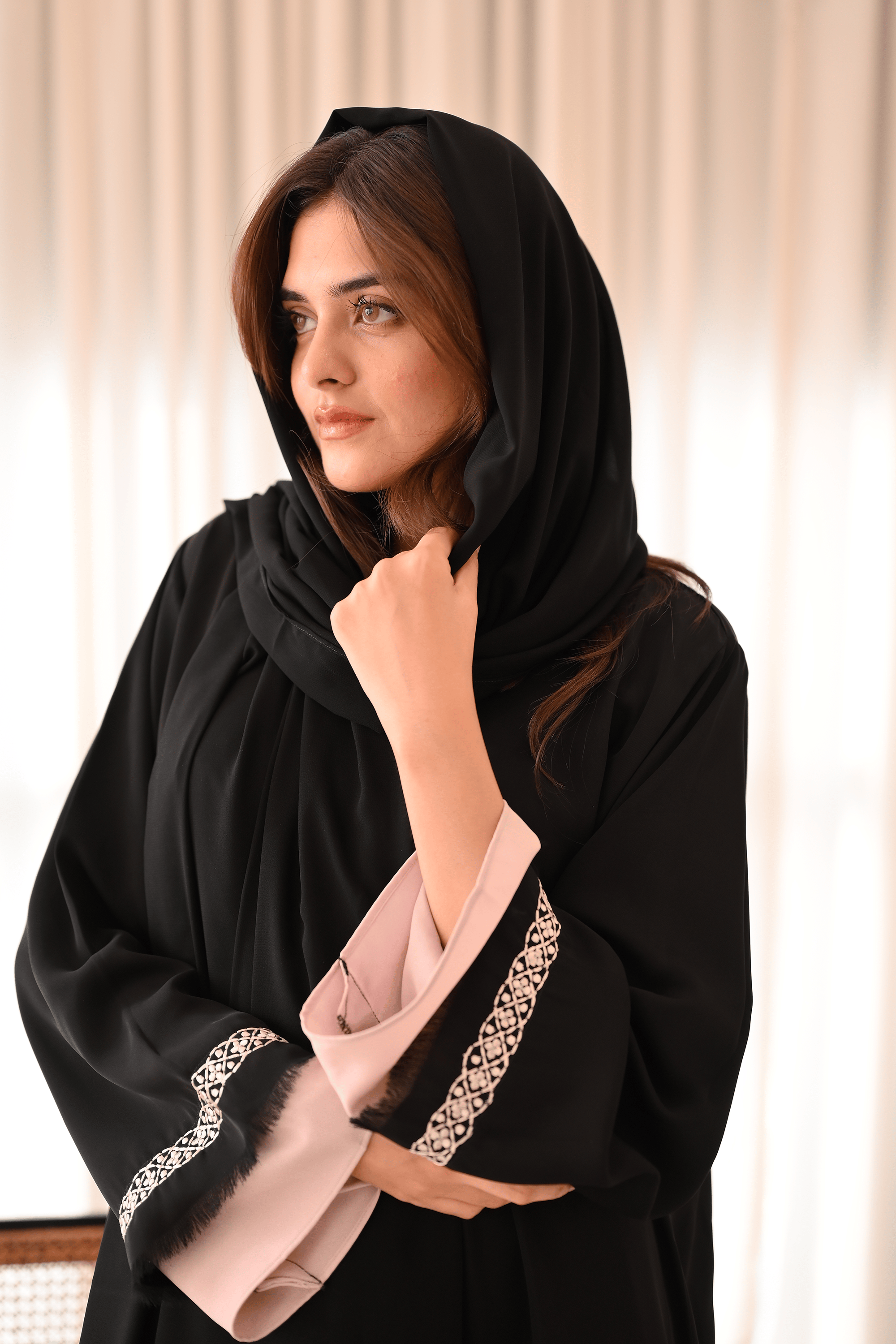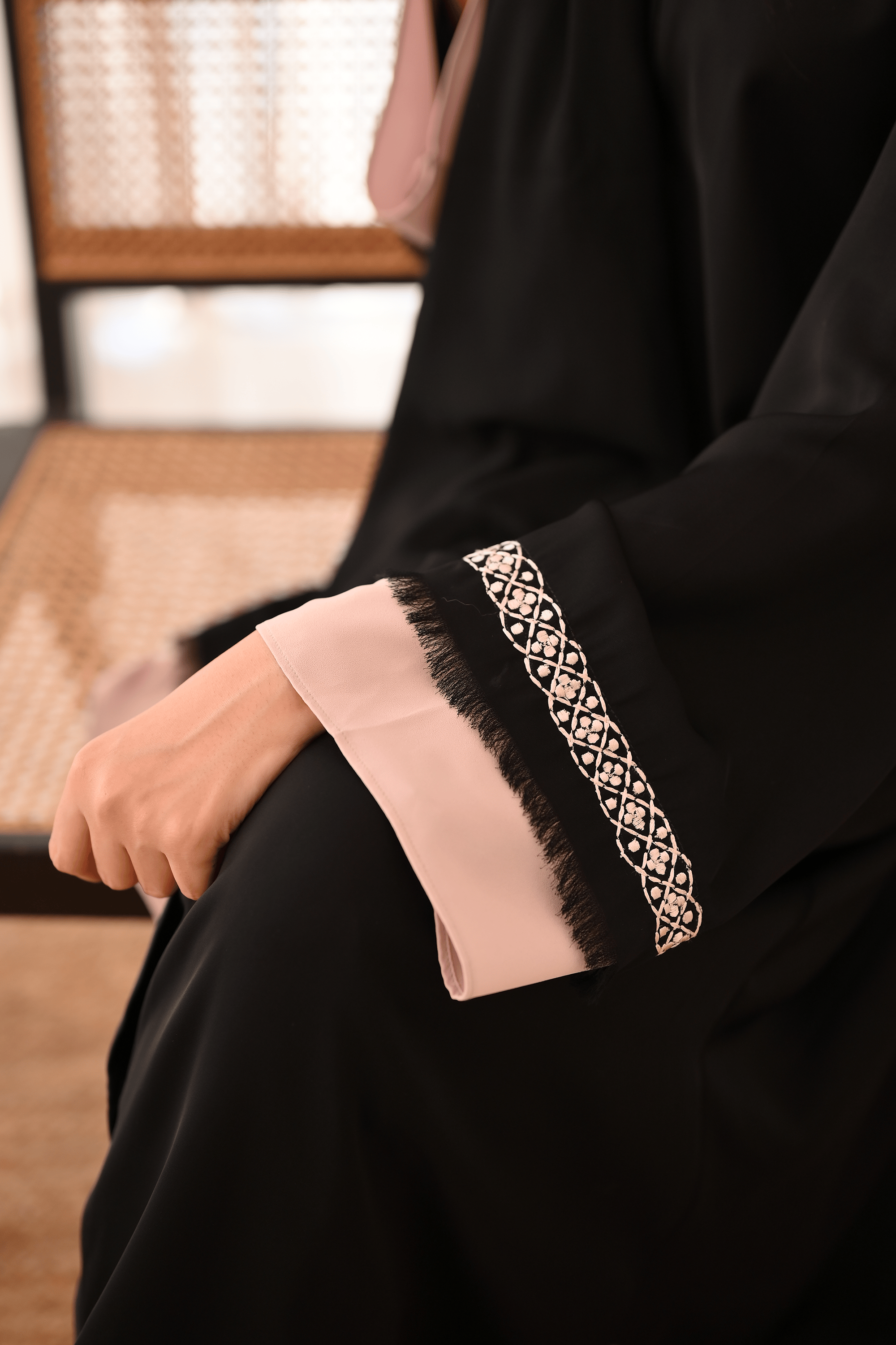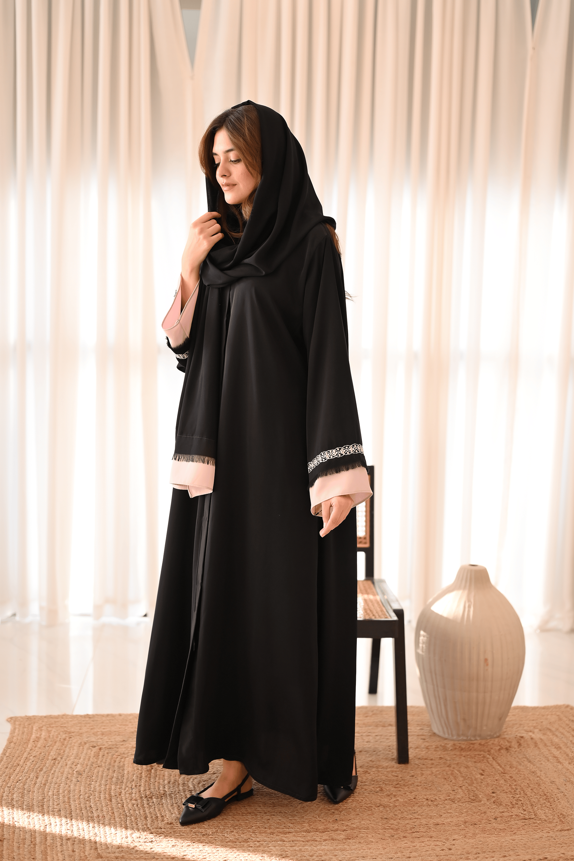 Make an impactful statement with this classic black minimalist embroidered abaya with a touch of powder pink hues.